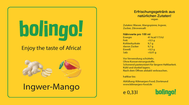 bolingo! das afrikanische Erfrischungsgetränk gibt es in der fruchtig-scharfen klassischen Geschmacksrichtung. 3 Ingwer Mango, 3 Ingwer Maracuja und 3 Hibiskus Minze (0,3 L).
